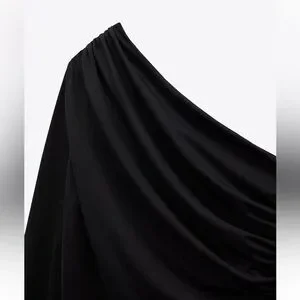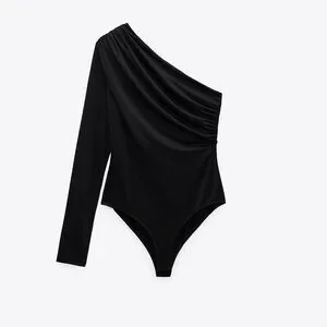 Bodysuit with asymmetric neckline. The black with ruched detail.