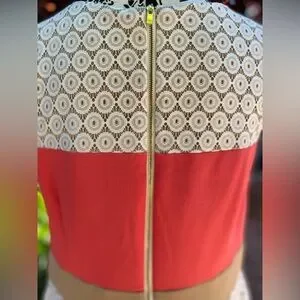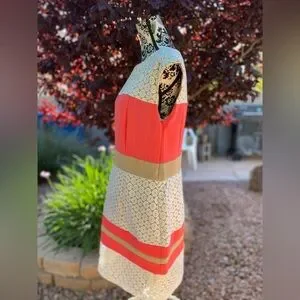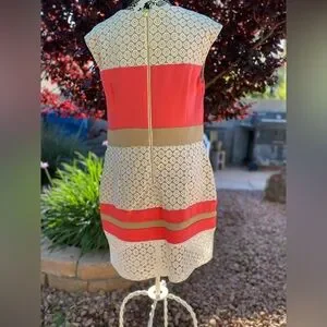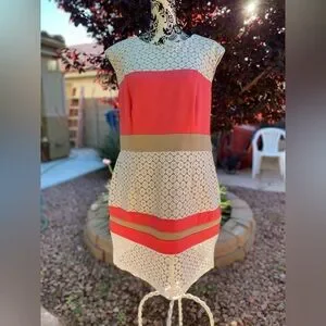 Beautiful coral detailed dress by Studio One. Lacey overlay. Exposed back zipper entrance. Lined. Pockets. Stretchy. EUC.