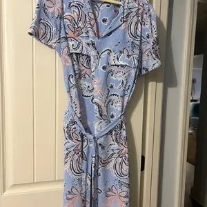 Cute 2x dress with belt. side pockets and 2 pockets in front. Item says dry clean, however, I have washed on delicate cycle and hang to dry.