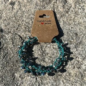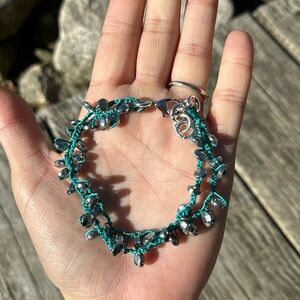 Hematite beads crocheted on teal thread with lobster clasp closure. Measures approximately 7.75”- 8.75”in adjustable. Handmade in Maine with ❤️