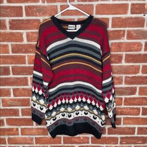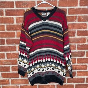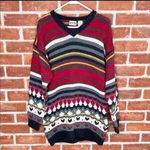 Vintage 90s chunky knit oversized patterned print V-neck sweater