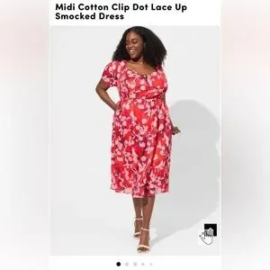 Torrid MIDI cotton clip dot lace up smocked dress.