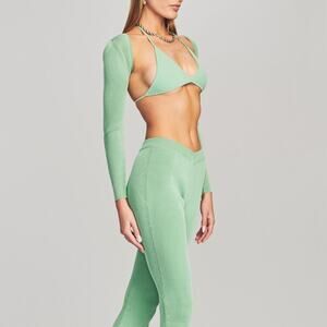 Ribbed shrug sweater. Fitted and cropped. Matching bra top. Contrast trim. Wear with our Lux Pant. Shown here in Green.