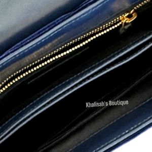 Quilted velvet shoulder bag in dark blue. Tonal buffed leather trim throughout. Adjustable and detachable shoulder strap featuring lanyard-clasp fastening. Logo plaque at face. Foldover flap featuring press-stud fastening. Logo stamp in gold-tone, leather logo patch, zippered pocket, patch pockets, and three card slots at interior. Textile lining in black. Antiqued gold-tone hardware. Tonal stitching. Approx. 7.5 length x 6 height x 3 width.