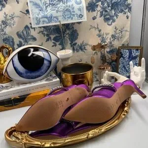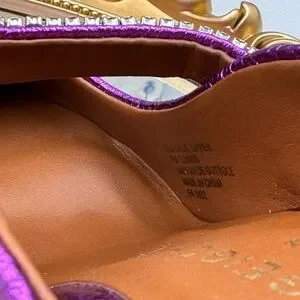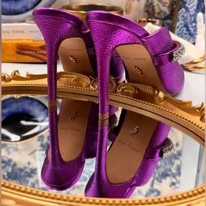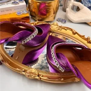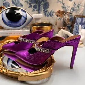 A sparkling, crystal-encrusted strap accentuates the mule-inspired silhouette of a pointy-toe pump shaped from gleaming purple metallic leather.