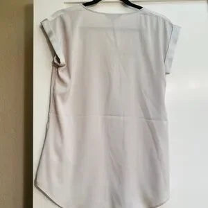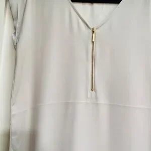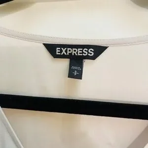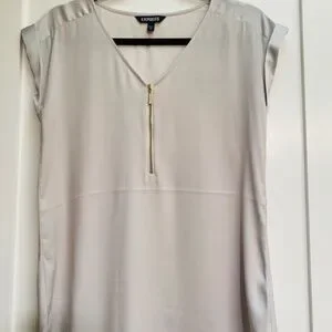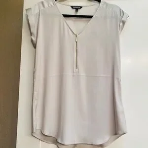 Express Short Sleeve satin blouse with shiny satin detail to shoulders and sleeve cuff in a beautiful creamy bone color with a gold tone zipper. Brand new, never worn. Size Small. No snags, stains or damage to the material.
