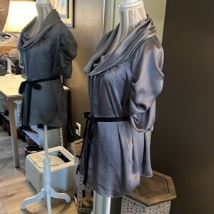Gently preloved. BCBG Maxazria, gray blouse, size small. Puff sleeve, draped neck, gorgeous designer details.