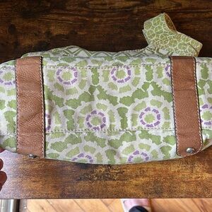 Canvas with leather accents. Key and luggage tag included.