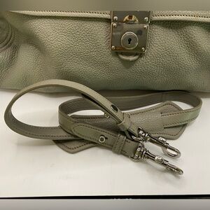 Excellent preloved condition. Grey leather bag with top handle and detachable strap, so it can be worn two ways. Locking mechanism on the front secures the flap (no key). Opens to pristine dark grey satin interior with multiple compartments and two zippered pockets. Sides can be unsnapped to allow for extra space. Truly a beautiful, versatile piece. Comes with a Certificate of Authenticity from Real Authentication and an unbranded dust bag.