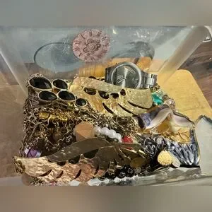 There are some wearable, broken, unclean, tangled, scrap, chains, beads, metals, Silver tone, gold tone, rhinestones, beads, bracelets, earrings and more