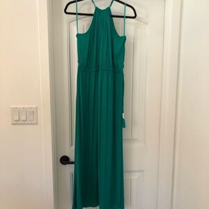 Stunning emerald color maxi dress from Ann Taylor Loft. This was only worn once and dry cleaned. I actually noticed after I took the photos the silver thing on the waist tie comes off, the cleaner put it on to protect the tassels. Features a tie waist and tie in the back of the neckline. Home is smoke and pet free.