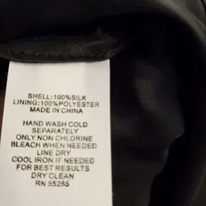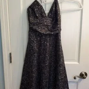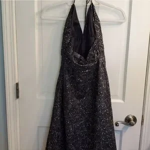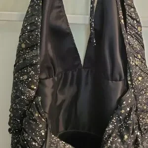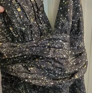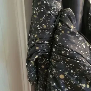 Classic, timeless, black midi silk dress with gold and silver splatter pattern.