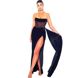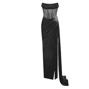 Make your entrance a grand one with thisclassic strapless corset, subtle ruching details, beautiful velvet draping, and high side slit fit for a goddess. Crafted with high-quality fabrics, the flattering ruched bodice and cascading sash deliver a timelessly chic look that will make an impression. With a back zipper closure and side slit for ease of wear, it fits true to size, so you can step out confidently knowing you look your best! Put the finishing touches on your perfect evening out look with this timeless gown, crafted from lavish stretch velvet and finished with sheer mesh boning.