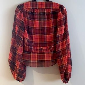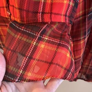 New! Lini black red yellow plaid long sleeve peplum blouse with sheer back, sleeves and peplum panel - top front (breast panels) are double layered - plunge v-neck with pretty button detail at front closure - brand new - no tags - pit to pit is approx 18” - length from highest shoulder is 21.25” - Great for the holidays - this is a very small top that will not fit a size small - would recommend for dress size 2, as it has an approx 26” non-stretch waist (measured at center of button panel)