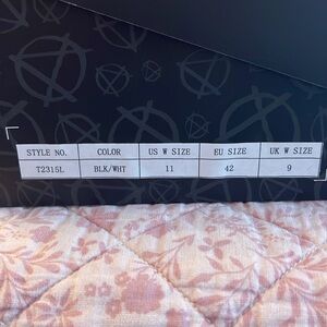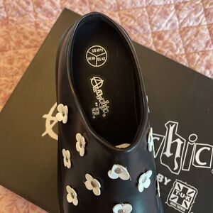 Brand new never worn T.U.K. Black Burnished White Flower Anarchic Bubble Clog. The upper is made of a vegan friendly soft burnished PU with flower detailing. Features a bubble heel that stands at 3 1/2 inches and 1 3/4 inches in the front.