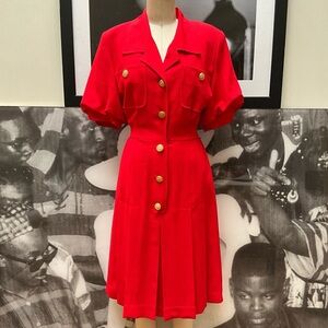 Military Sailor 80s bright red Dress Emporio Oleg Cassini button down drop waist shirt dress. Ballon elaborate short sleeves. Gold button closure. Knee length dress. Great to wear casual with dad sneakers or wear with ballerina flats for a more Parisian look. Tagged: vintage size 6 but fits like a 2 or 4 (see measurements)