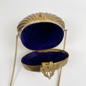 Features: Royal purple velvet interior, chain strap, clamshell shape, ornate hinged lid