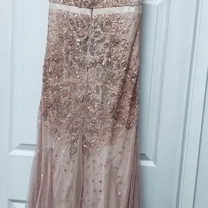This jewelled gown is perfect for the fanciest occasion. It’s a 4P but is very long- shoulder to hem is 59”. It’s 27” around the ribbon below the bust. Chiffon fabric layered over the full slip of a bronzed pink shade. Very elegant!