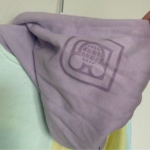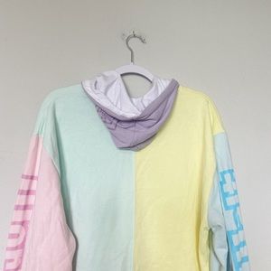Disney World Colorblock Pastel Hooded Sweatshirt Pink/Blue/Yellow, Size Medium. Cozy and colorful hooded sweatshirt, perfect for the true Disney fan! Brighten your outlook and outfit with this pastel colorblock pullover from The Most Magical Place on Earth. The fully lined drawstring hood and front pouch pocket will keep you cozy on any outing. Pullover hoodie with pieced construction featuring a green and yellow body, Walt Disney World logo across sleeves and chest, ''D'' logo on purple, fully lined drawstring hood. Long sleeves in blue and pink, purple pouch pocket. Ribbed cuffs and hem. 60% cotton / 40% polyester. Part of the Disney Parks Get Into Character Collection.
