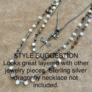 Beautiful Czech glass beads and freshwater potato pearls hang suspended on a crocheted mocha beige cording. Glass bead colors are earthy rich dark browns. Interspersed silver plated flower beads add a fleck of silver. Necklace closure is a silver tone dragonfly button made by TierraCast. Can be worn casually or for dress.