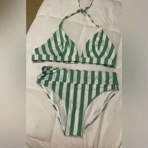 Halter tie around the neck with adjustable hook around back. Bikini cut bottom. Green and white stripes size M Bottoms and XL Top NWT The top runs small
