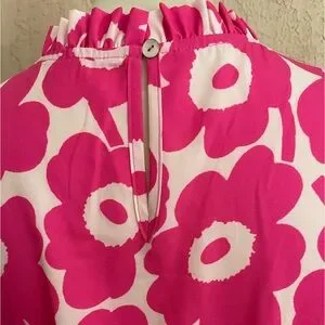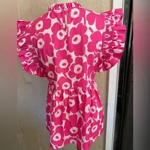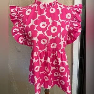 Butterfly sleeve with elastic ruffles, baby doll style. Pretty pink and white flower print. 100% polyester. Pit to pit is 17”. No size or fabric label but it’s a small.