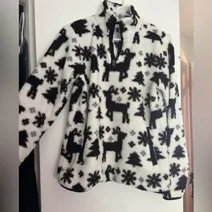 This beautiful pullovers was only worn once. It is a soft teddy material, very soft since it’s only been washed once. It was reindeer and snowflakes all over.