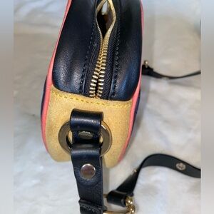 Lovingly worn Missoni crossbody with circular metal hardware accents. Black calf quilted leather offset by tan suede and pink leather trim. This is a fun, versatile bag! Hardware is in good condition with no tarnish. Suede and pink trim have slight wearing.