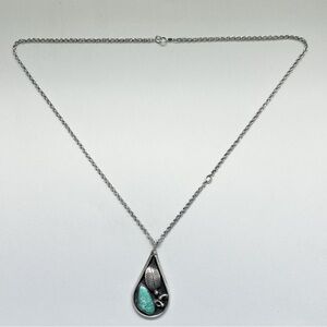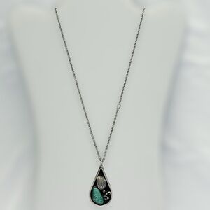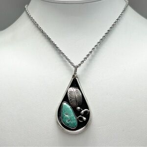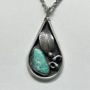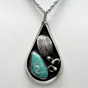 Vintage Southwestern Turquoise Sterling Silver Adjustable Necklace. Interesting sterling silver pendant with oval sea green turquoise, feather and beading. Probably Navajo.