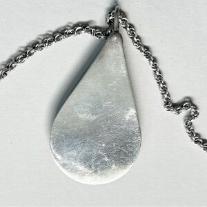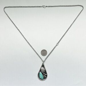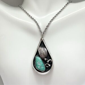 Pendant is 28 x 49 mm, turquoise is 10 x 20 mm. Chain is 24 inches, but can be shortened to 15 inches by using additional ring on chain. Pendant tested as sterling, chain marked sterling. 22.4g