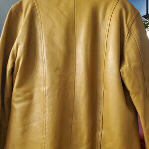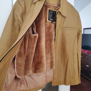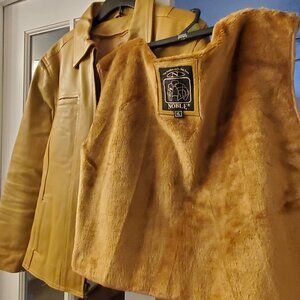 Noble lightly used leather jacket. Perfect for fall and colder evenings. Light brown with brown plush removable winter lining. XL in size but will fit a slender body more comfortably.