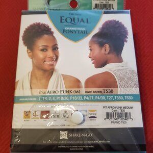 Shake-N-Go drawstring ponytail. Burgundy and brown with tight curls. In original packaging and never been used.