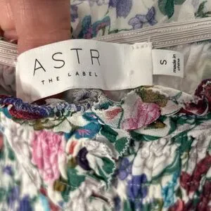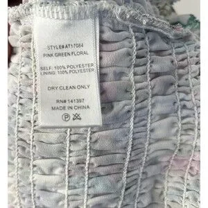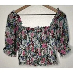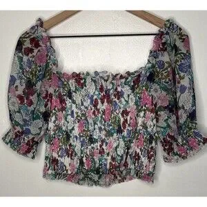 This ASTR The Label top is perfect for any garden party or special occasion. The floral pattern and green color make it a great addition to any wardrobe. The square neckline and balloon sleeves add a touch of elegance, while the stretchy tight fit ensures a flattering look. Made from polyester, this blouse is dry clean only. It is a size small and has a pullover closure. The cropped style and smocked detailing make this top a must-have for any fashion-forward woman. Vintage lovers will also appreciate this item as it is not vintage.