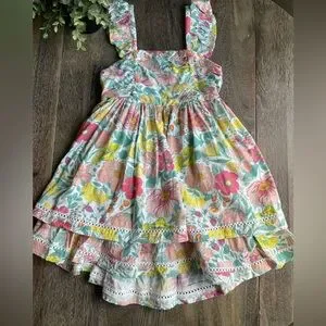 Sold on cross post. This dress is stunning!!! Ruffle sleeves. Pleated top. Smocked back. Beautiful layers. High low style. Eyelet trim. Cotton with texture. Back has open detail with bow. Eyelet trim. Size 5. Brand new with tag attached.