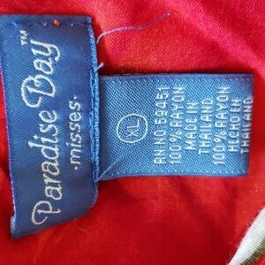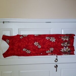 This is a very pretty tropical print dress! It's shades of red with white & gold flowers with green leaves.
