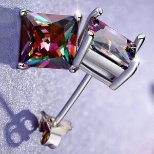 Mystic Rainbow Topaz 3.50CT Princess Cut Earring Studs, 925 Sterling Silver 18K White Gold Plated