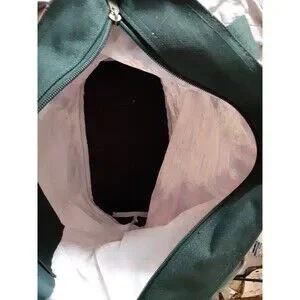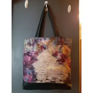 This tote bag is an excellent addition to any art lover's collection. The bag features a beautiful impressionist painting by Claude Monet. The bag is made of lightweight polyester material and has a green canvas handle/strap with black hardware. The bag is vintage and has a white lining.