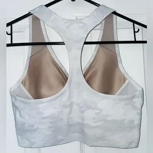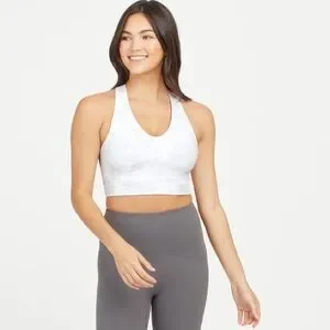 “White Camo” Spanx Women’s Longline Medium Impact sports bra. Racerback design. V neck. Medium support sports bra/crop top hybrid. Under-bust band prevents rolling and digging in. Breathable, sweat wicking and quick drying fabric. Chlorine & salt water resistant.