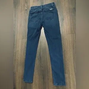 Size 24, Joe’s Jeans, dark wash, skinny, classic 5 pocket, laying flat measures approximately 13in across the waist, 8 1/2in rise, 27 1/4in inseam, 4 1/2in leg opening, 64% cotton, 21% rayon, 13% polyester & 2% elastane, EUC, no stains or holes in fabric, distressing/wear to edges of pockets, please see pictures, smoke free home