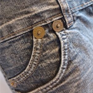 2 front pockets on each side, 2 back pockets Huge metal button on front with logo stamp, rivets are logo stamped, Brown Logo patch on back waistband