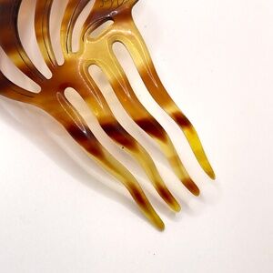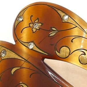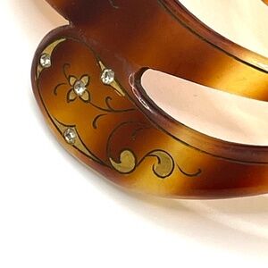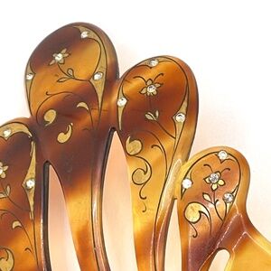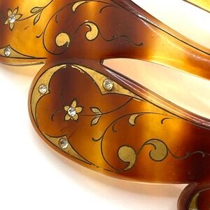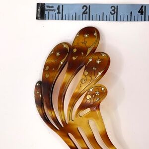 Vintage tortoiseshell lucite decorated large hair comb. The top portion of the comb is decorated with gold paint and accented with small rhinestones in a flourish design. It is a modified dome shape measuring about 5 3/4" long and 3 1/2" wide. All of the small rhinestones are in place. Pre-owned in very good condition. Please ask if you have questions.