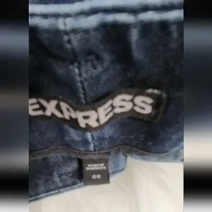 These women's Express dark blue denim shorts sit just below belly button and reach to about mid-thigh. A great sexy yet classy style for summer days! Has a hidden fastener waistband with belt loops. Also has front side and back pockets. Add your favorite summer sandles or wedge and show off your sun tanned legs!! Very flattering shorts! No rips stains or tears!
