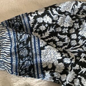 The sleeves hit to the elbow. Black background with white flowers and blue interwoven in them. Sleeves have a more prominent blue. Measurements are in pictures