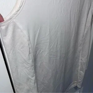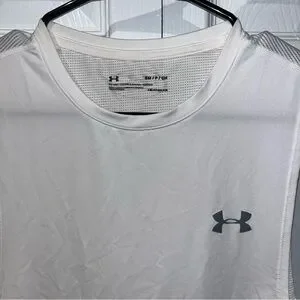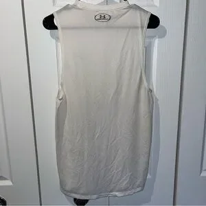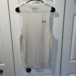Under Armour men’s size small Heatgear Sonic fitted tank in white. Ventilated back. Well worn, some minor fading/discoloration of fabric, but overall still in great shape.