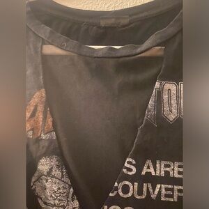 Black tank with some burgundy writing. Mesh over the chest. Pink and rock and roll feel. Size 1