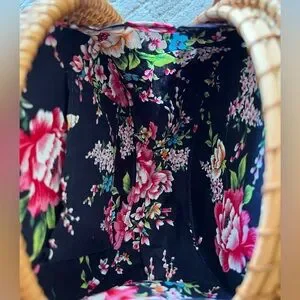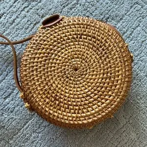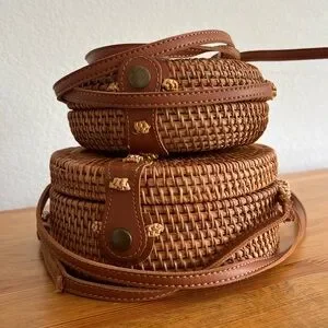 Great condition. This is a bundle set. You get two bags! Both are round woven rattan crossbody bags with adjustable faux leather straps. Snap closure. Floral print fabric interior. One internal slip pocket in each. The larger bag has some damage to the strap (pictured). The smaller bag has no callouts.