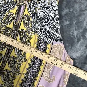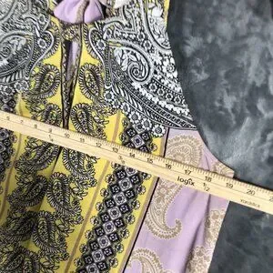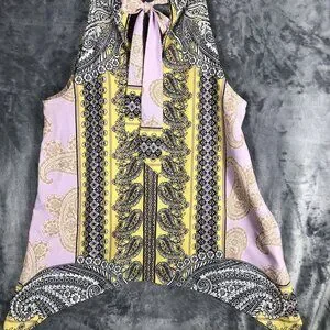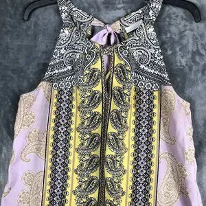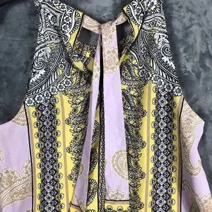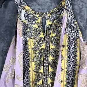 Add a pop of color to your wardrobe with this beautiful yellow and lavender shirt from New York and Company. The sleeveless tunic blouse features a keyhole neckline and a pullover closure, making it perfect for any occasion, whether it's a casual day out or a business meeting. The lightweight, machine washable polyester material with a rayon fabric type ensures easy care and comfortable wear. The shirt comes in a regular fit and is available in size medium. The colorful geometric pattern adds a touch of fun to the shirt, making it perfect for summer, fall, or spring.