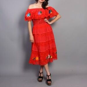 Vintage red dress with full lining. Elastic at shoulders and waist which extends to about 22" each. Small ribbon tie at waist. Floral embroidery on front and back. Perfect condition, no signs of wear. first picture is of similar style