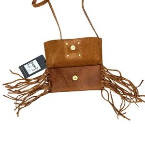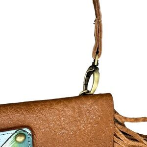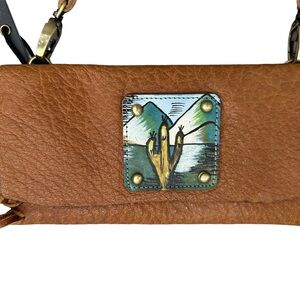 American Darling Cactus Crossbody Bag features a painted cactus patch and trimmed with long fringe. Removable strap. 100% leather.