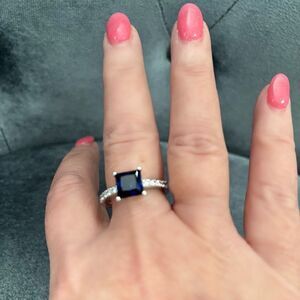 Sterling silver princess cut blue sapphire and cubic zirconia ring. Sz: 10